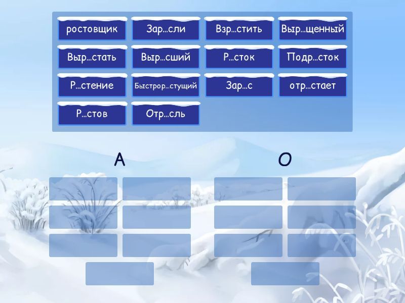 А: Выр...стать, Отр...сль, Выр...щенный, Взр...стить, Р...стение, Быстрор...стущий, отр...стает, О: Р...сток, Зар...с, Подр...сток, Зар...сли, Р...стов, Выр...сший, ростовщик,