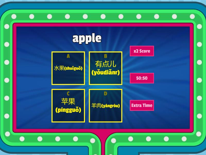 1) apple a) 水果(shuǐguǒ) b) 有点儿 (yǒudiǎnr) c) 苹果 (píngguǒ) d) 羊肉(yángròu) 2) fruit a) 说(shuō) b) 水果(shuǐguǒ) c) 苹果 (píngguǒ) d) 羊肉(yángròu) 3) watermelon a) 有点儿 (yǒudiǎnr) b) 西瓜 (xī guā) c) 面(miàn) d) 肉 (ròu) 4) to speak a) 肉 (ròu) b) 买(mǎi) c) 因为(yīnwèi) d) 说(shuō) 5) meat a) 水果(shuǐguǒ) b) 肉 (ròu) c) 为什么 (wèi shén me) d) 苹果 (píngguǒ) 6) noodles a) 甜 tián b) 面(miàn) c) 说(shuō) d) 西瓜 (xī guā) 7) lamb/mutton a) 羊肉(yángròu) b) 甜 tián c) 肉 (ròu) d) 为什么 (wèi shén me) 8) a little bit a) 为什么 (wèi shén me) b) 甜 tián c) 肉 (ròu) d) 有点儿 (yǒudiǎnr) 9) because a) 西瓜 (xī guā) b) 买(mǎi) c) 羊肉(yángròu) d) 因为(yīnwèi) 10) why a) 肉 (ròu) b) 有点儿 (yǒudiǎnr) c) 因为(yīnwèi) d) 为什么 (wèi shén me) 11) to buy a) 肉 (ròu) b) 为什么 (wèi shén me) c) 买(mǎi) d) 西瓜 (xī guā) 12) sweet a) 甜 tián b) 因为(yīnwèi) c) 面(miàn) d) 有点儿 (yǒudiǎnr)