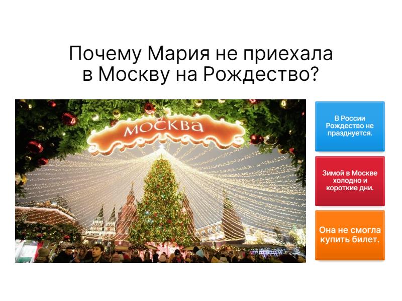 1) Почему приезд Марии был важен для Карлоса? a) Это заставило его задуматься о значении России в его жизни. b) Он собирался найти работу в Москве. c) Он хотел переехать в другой город вместе с Марией. 2) Почему Мария не приехала в Москву на Рождество? a) В России Рождество не празднуется. b) Зимой в Москве холодно и короткие дни. c) Она не смогла купить билет. 3) Что празднуют первого мая в России? a) День Победы b) Международный день трудящихся c) День Конституции 4) Что отмечают девятого мая в России? a) День русского языка b) День Победы c) Пасха 5) На каком транспорте Карлос хотел поехать в аэропорт? a) На метро b) На автобусе c) На поезде "Аэроэкспресс" или на маршрутке 6) Почему Карлос в итоге выбрал такси? a) Он проспал и опаздывал. b) Такси оказалось дешевле. c) Он хотел сделать Марии сюрприз. 7) Сколько человек живёт в Москве? a) 5 миллионов b) 11 миллионов c) 20 миллионов 8) Почему Карлос боялся, что Марии не понравится Москва? a) В городе мало достопримечательностей. b) В Москве много людей и пробок. c) В городе часто идут дожди. 9) О какой площади говорится в тексте? a) о Красной площади b) о Театральной площади c) о Манежной площади 10) Что обычно удивляет иностранных туристов в московском метро? a) Дешёвые билеты b) Длина линий, красота станций и скорость эскалаторов c) Старинные поезда 11) Где в Москве есть дома в 30 этажей? a) В центре города b) В спальных районах c) На Красной площади 12) Сколько полос может быть на московских проспектах? a) 2 полосы b) 4 полосы c) 6 полос в каждую сторону 13) О каком недостатке Москвы говорится в тесте? a) Мало музеев b) Высокие цены на отели c) Нет надписей на латинице и мало людей говорят на иностранных языках 14) Что почувствовала Мария через несколько часов после приезда? a) Ей не понравился город. b) Она хотела уехать домой. c) Она почувствовала энергию и динамизм Москвы. 15) Что Мария поняла о русских через пару дней? a) Они всегда неприветливые и сухие. b) Они не любят общаться с иностранцами. c) Они могут быть радушными и тёплыми, когда с ними познакомишься. 16) Карлос узнал, что символом семейного счастья в России является... a) Дача b) Квартира в многоэтажке c) Большой дом в центре города 17) Что является настоящим горем России по мнению Карлоса? a) Высокий уровень безработицы b) Проблемы с общественным транспортом c) Алкоголизм 18) Что Мария сказала накануне своего отъезда? a) Ей не понравился город. b) Ей хотелось остаться в Москве навсегда. c) Она поняла, почему Карлос любит Россию. 19) Какого числа прилетела Мария? a) 11-ого мая b) 30-ого апреля c) 9-ого мая 20) Как Саша и его семья встретили Марию на даче? a) Они приготовили шашлыки и пели песни у костра. b) Они устроили вечеринку. c) Они не пригласили её на дачу. 21) Чем друзья помогали Карлосу и Марии? a) Написали путеводитель и показывали город b) Оплатили билеты в музеи c) Предложили работу