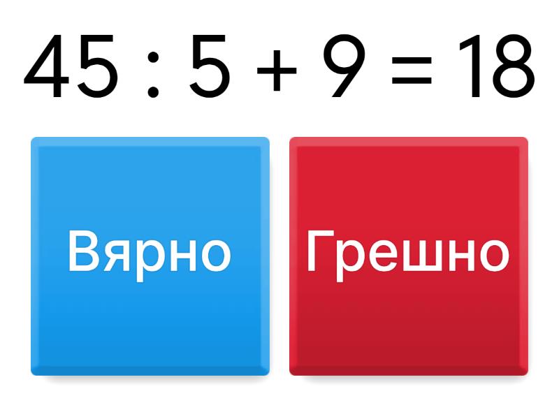 1) 45 : 5 + 9 = 18 a) Вярно b) Грешно 2) 20 : 5 = 4 a) Вярно b) Грешно 3) 5 . 9 = 40 a) Вярно b) Грешно 4) 4 . 8 = 45 a) Вярно b) Грешно 5) 35 : 5 = 8 a) Вярно b) Грешно 6) 5 . 8 = 45 a) Вярно b) Грешно 7) 5 . 2 = 40 a) Вярно b) Грешно 8) 45 : 5 = 9 a) Вярно b) Грешно 9) 18 : 3 = 6 a) Вярно b) Грешно 10) 3 . 4 = 14 a) Вярно b) Грешно 11) 9 . 2 = 18 a) Вярно b) Грешно 12) 3 . 8 = 45 a) Вярно b) Грешно 13) 6 . 3 = 18 a) Вярно b) Грешно 14) 7 . 5 = 35 a) Вярно b) Грешно 15) 2 . 5 = 10 a) Вярно b) Грешно 16) 30 : 5 = 5 a) Вярно b) Грешно 17) 8 . 3 = 28 a) Вярно b) Грешно 18) 7 . 5 = 35 a) Вярно b) Грешно 19) 40 : 4 = 9 a) Вярно b) Грешно 20) 6 . 5 = 30 a) Вярно b) Грешно 21) 24 : 3 = 6 a) Вярно b) Грешно 22) 5 . 7 + 30 = 45 a) Вярно b) Грешно 23) 14 : 1 = 14 a) Вярно b) Грешно 24) 36 : 4 + 12 = 20 a) Вярно b) Грешно 25) 40 : 5 = 8 a) Вярно b) Грешно 26) 16 : 4 = 3 a) Вярно b) Грешно 27) 7 . 5 - 5 = 30 a) Вярно b) Грешно 28) 4 .4 = 15 a) Вярно b) Грешно 29) 10 : 1 = 1 a) Вярно b) Грешно 30) 10 : 5 = 2 a) Вярно b) Грешно 31) 12 : 4 = 3 a) Вярно b) Грешно 32) 8 : 2 = 4 a) Вярно b) Грешно 33) 4 . 4 = 16 a) Вярно b) Грешно 34) 2 : 2 = 0 a) Вярно b) Грешно 35) 5 . 5 = 25 a) Вярно b) Грешно 36) 4 . 2 = 6 a) Вярно b) Грешно 37) 6 . 5 = 35 a) Вярно b) Грешно 38) 5 : 5 .5 = 5 a) Вярно b) Грешно 39) 40 - 20 : 5 = 36 a) Вярно b) Грешно 40) 50 : 5 = 10 a) Вярно b) Грешно 41) 5 . 3 = 25 a) Вярно b) Грешно 42) 32 : 5 = 8 a) Вярно b) Грешно 43) 1 . 5 = 1 a) Вярно b) Грешно 44) 8 . 5 = 40 a) Вярно b) Грешно