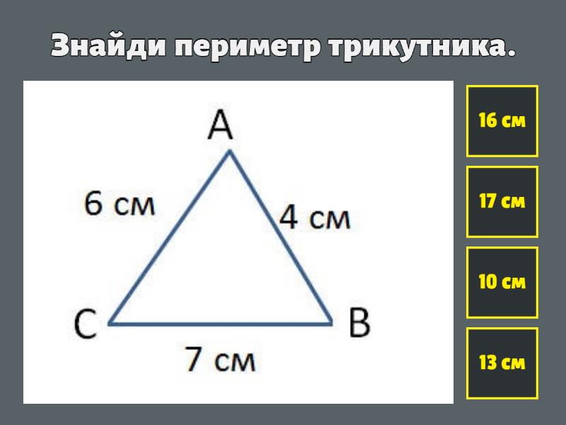 1) Знайди периметр трикутника. a) 16 см b) 17 см c) 10 см d) 13 см 2) Знайди периметр чотирикутника. a) 15 см b) 10 см c) 5 см d) 14 см 3) Знайди периметр прямокутника. a) 20 см b) 14 см c) 18 см d) 28 см 4) Знайди периметр квадрата. a) 22 см b) 24 см c) 12 см d) 6 см 5) Знайди периметр прямокутника. a) 16 см b) 5 см c) 3 см d) 8 см 6) Знайди периметр п'ятикутника. a) 5 см b) 10 см c) 14 см d) 7 см 7) Знайди периметр квадрата. a) 10 см b) 15 см c) 20 см d) 25 см 8) Знайди периметр прямокутника. a) 16 см b) 8 см c) 5 см d) 3 см