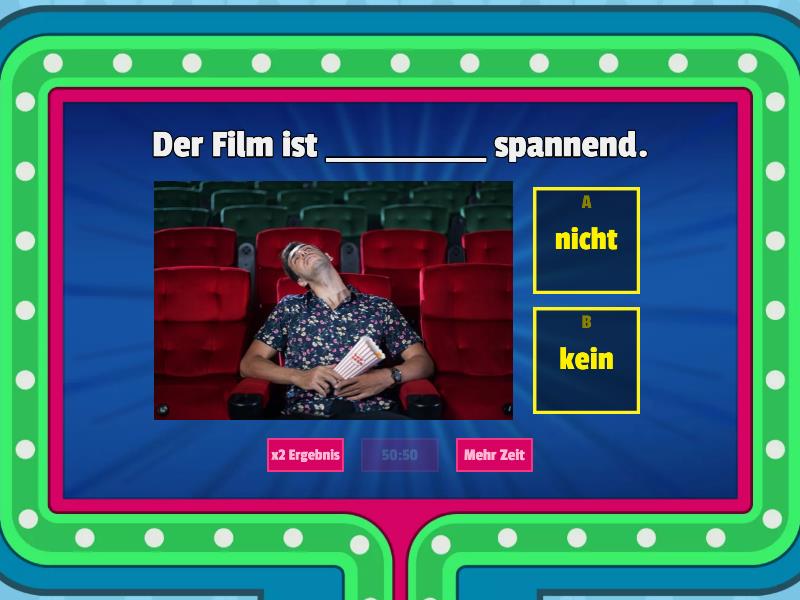 1) Der Film ist __________ spannend. a) nicht b) kein 2) Sie arbeitet am Wochenende __________. a) nicht b) kein 3) Das ist __________ das Auto von Lukas. Das ist mein Auto. a) nicht b) kein 4) Ich komme __________ aus Frankreich. a) nicht b) kein 5) Das ist __________ Lehrer. Das ist Student. a) nicht b) kein 6) Ich weiß es __________. a) nicht b) kein 7) Der Bus fährt __________ nach München. a) nicht b) kein
