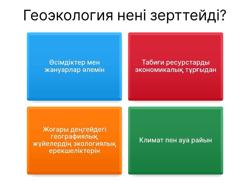 1) Геоэкология нені зерттейді? a) Өсімдіктер мен жануарлар әлемін b) Табиғи ресурстарды экономикалық тұрғыдан c) Жоғары деңгейдегі географиялық жүйелердің экологиялық ерекшеліктерін d) Климат пен ауа райын 2) . «Геоэкология» терминін алғаш кім енгізді? a) А. Гумбольдт b) К. Тролл c) В. Вернадский d) Н. Федоров 3) Геоэкология жеке ғылым ретінде қай жылдары қалыптасты? a) XIX ғасырдың басында b) XX ғасырдың 30–40-жылдары c) XXI ғасырдың басында d) XVIII ғасырдың соңында 4) Геоэкологиялық зерттеулердің басты мақсаты: a) Табиғатты экономикалық тұрғыдан бағалау b) Қала құрылысын жоспарлау c) Табиғи ортаны сақтау және ресурстарды тиімді пайдалану d) Топырақ құрамын анықтау 5) Геоэкологиялық жоспарлау дегеніміз – a) Табиғатты пайдалану мен қорғау шараларын жоспарлау b) Аумақтың климаты мен өсімдік жамылғысын анықтау c) Топырақтың сапасын анықтау d) Қалалардағы өнеркәсіп аймақтарын бөлу 6) Геоэкологиялық аудандастырудың мақсаты a) Әкімшілік шекараларды белгілеу b) Климаттық белдеулерді анықтау c) Аумақтарды экологиялық жағдайына қарай бөлу d) Геологиялық құрылымды сипаттау 7) Геоэкологиялық зерттеулер не үшін өзекті? a) Климаттық өзгерістерді болжау үшін b) Қала жоспарларын құрастыру үшін c) Жаңа өсімдік түрлерін табу үшін d) Табиғатты тиімді пайдалану және қоршаған ортаны қорғау үшін