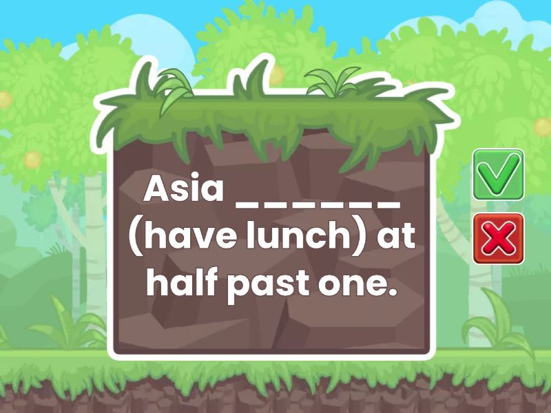 I ______ (get up) at 7 o’clock. - get up, She ______ (have breakfast) at 8:15. - has, We ______ (go to work) at 9. - go , Asia ______ (have lunch) at half past one. - has , Vero ______ (watch TV) at 9 in the evening. - watches, I ______ (go to bed) at midnight - go,