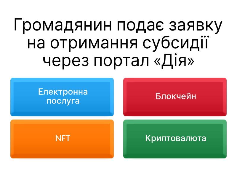 1) Громадянин подає заявку на отримання субсидії через портал «Дія» a) Електронна послуга b) Блокчейн c) NFT d) Криптовалюта 2) Люди голосують онлайн за проєкти громадського бюджету у своєму місті. a) Криптовалюта b) Електронне урядування c) NFT d) Кодування 3) Користувач підписує договір онлайн за допомогою спеціального коду, який підтверджує його особу. a) Кодування b) Цифровий підпис c) Електронна демократія 4) Дані про всі транзакції з криптовалютою зберігаються у відкритій, незмінній цифровій базі. a) Блокчейн b) Цифровий підпис c) Електронна демократія 5) Ти надсилаєш повідомлення, яке може прочитати лише отримувач, бо воно захищене спеціальним ключем. a) Шифрування b) Електронна демократія c) Блокчейн 6) Програма перетворює текст у вигляд QR-коду для зручного зчитування. a) Електронна послуга b) NFT c) Кодування 7) Людина використовує біткоїн для оплати товару в інтернет-магазині. Що вона використовує? a) Кодування b) Електронну демократію c) Цифровий підпис d) Криптовалюту