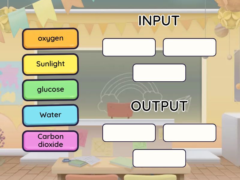 INPUT: Carbon dioxide, Water, Sunlight, OUTPUT: glucose, oxygen,