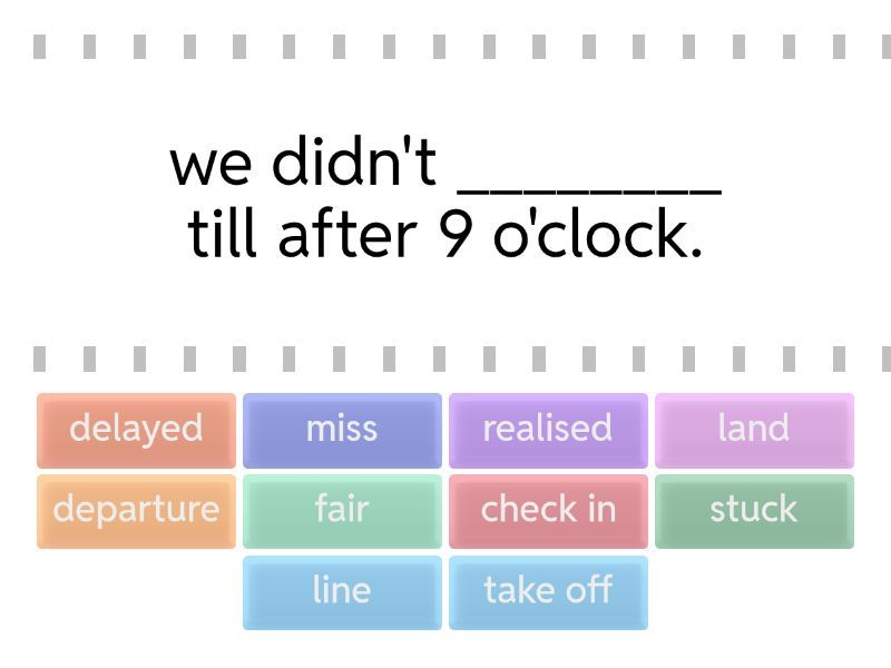 take off - we didn't ________ till after 9 o'clock., check in - If you ______ online it will save time at the airport., departure - I checked the _________ board to see which gate we had to go to. , stuck - We got _________ in traffic on the motorway., land - we're due to _____ at 6:30., miss - Hurry up, or you'll ____ the train., fair - To be ______, it's several years since I missed a plane., delayed - I sometimes missed a flight if my train was ______., realised - I _____ that reading was actually enjoyable., line - The train had to stop because there was something on the _______.,