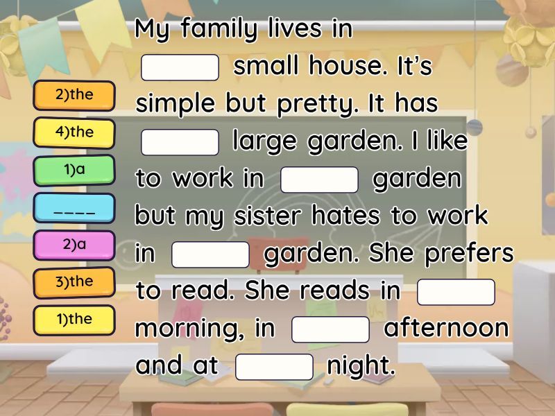 My family lives in ____ small house. It’s simple but pretty. It has ____ large garden. I like to work in ____ garden but my sister hates to work in ____ garden. She prefers to read. She reads in ____ morning, in ____ afternoon and at ____ night. I give all of ____ vegetables to mom and dad. They like to cook in our small kitchen. I eat any vegetable but my sister eats only a few. My family always eats ____ breakfast and dinner together. We talk. We laugh. Then my sister washes ____ dishes. At ____ night dad likes to listen to ____ music. Mom works on ____ computer. I watch ____ television. And my sister reads. Soon we go to ____ bed. My parents go to bed late but my sister and I go to bed early. I’m ready to go to sleep but my sister wants to keep reading.