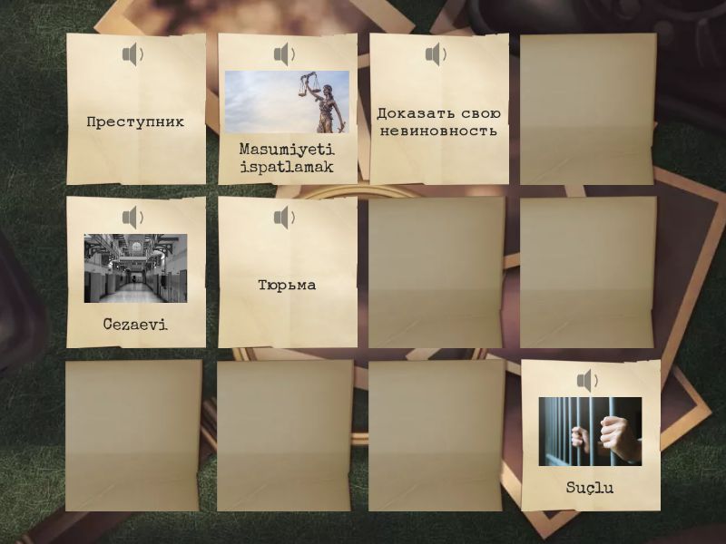Suçlu - Преступник, Cezaevi - Тюрьма, Masumiyeti ispatlamak - Доказать свою невиновность, Mahkemeye başvurmak - Подать заявление в суд, Tazminat - Денежная компенсация, Resmen ölü ilan edilmek - Быть официально признанным умершим,