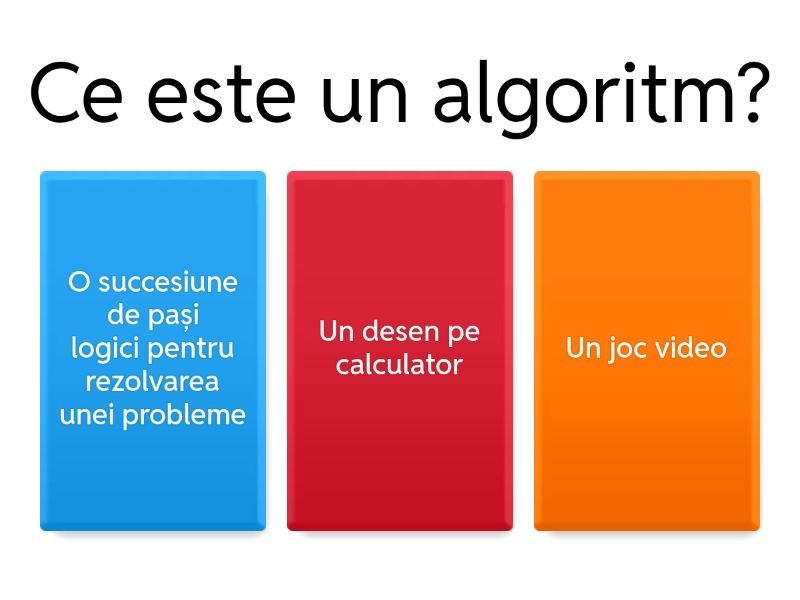 1) Ce este un algoritm? a) O succesiune de pași logici pentru rezolvarea unei probleme b) Un desen pe calculator c) Un joc video 2) Ce trebuie să aibă orice algoritm? a) Culori și sunete b) Un început, pași logici și un sfârșit c) Doar o imagine 3) Care dintre următoarele este un exemplu de algoritm din viața reală? a) O rețetă de gătit b) O melodie c) O fotografie 4) De ce este importantă ordinea pașilor într-un algoritm? a) Pentru că pașii pot fi făcuți în orice ordine b) Pentru că arată mai frumos c) Pentru că ordinea asigură un rezultat corect 5) Ce se întâmplă dacă un pas lipsește dintr-un algoritm? a) Rezultatul poate fi greșit b) Algoritmul merge mai repede c) Nu contează 6) Cum se numește forma grafică de reprezentare a unui algoritm? a) Diagramă de blocuri b) Tabel c) Desen animat 7) Cum se numește forma scrisă simplă a unui algoritm, cu instrucțiuni scurte? a) Pseudocod b) Poveste c) Cântec 8) Care dintre următoarele nu este un algoritm? a) Planul unei lectii b) Animal c) Instrucțiunile de montare a unui joc 9) Ce caracteristică NU este specifică unui algoritm? a) Claritate b) Ordine logică c) Ambiguitate 10) Ce pas ar trebui să fie primul în algoritmul „Pornește calculatorul”? a) Apasă butonul Power b) Deschide un document Word c) Salvează fișierul