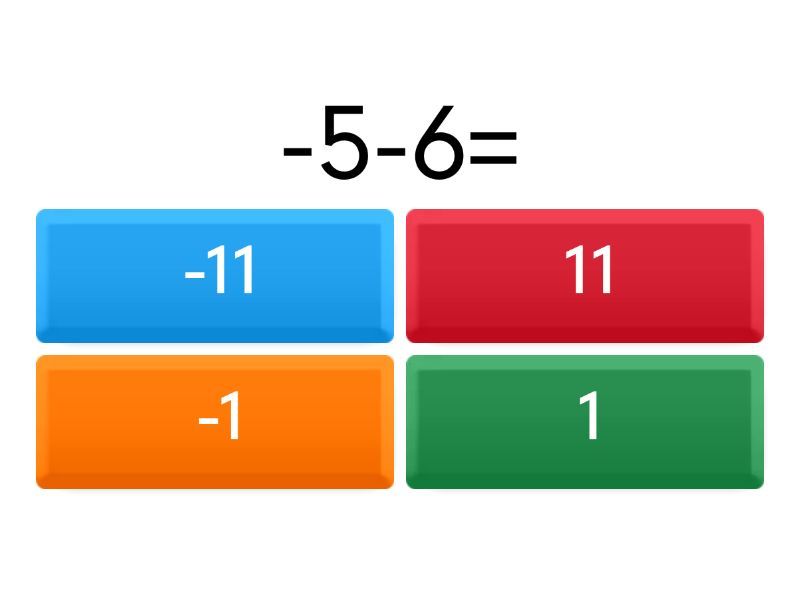 1) -5-6= a) -11 b) 11 c) -1 d) 1 2) 6 * (-8) = a) 48 b) -48 c) 42 d) -42 3) 8 -12 a) 4 b) -6 c) -4 d) 5 4) -10+10 a) 10 b) -20 c) 0 d) 20 5) 36÷(−9) a) -4 b) 4 c) 6 d) -8 6) −8×(−9) a) -72 b) 72 c) 63 d) 81 7) -60 : (-12) a) -5 b) 5 c) 6 d) 10 8) -65 : 5 a) 13 b) -15 c) -13 d) 14 9) -0,36 : 4= a) -0,9 b) 0,9 c) 0,8 d) 0,6 10) 0 : (-20,5) a) 0 b) -20,5 c) 20 d) 20,5
