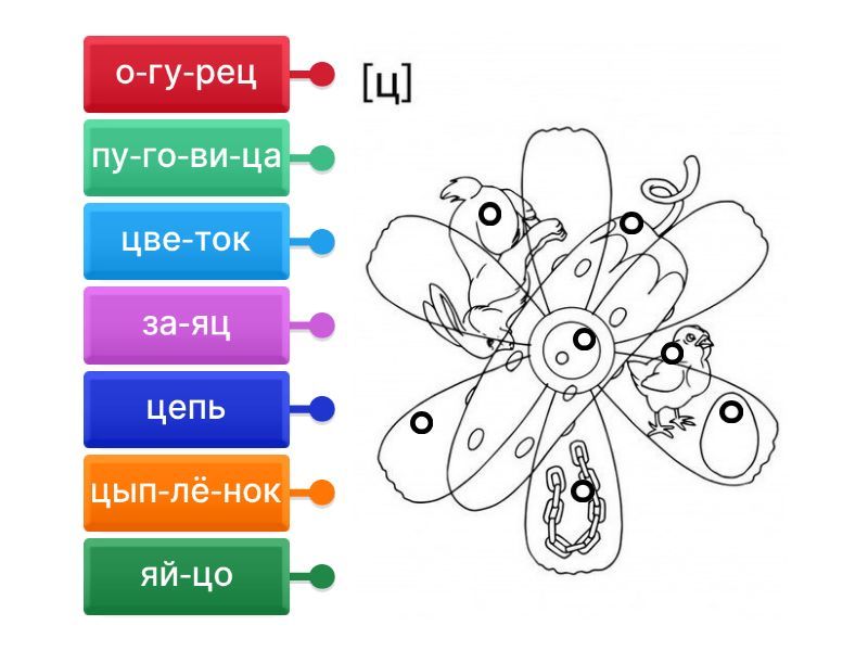 цве-ток, о-гу-рец, цып-лё-нок, яй-цо, за-яц, цепь, пу-го-ви-ца.