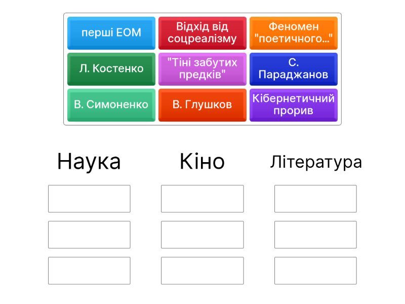 Наука: Кібернетичний прорив, В. Глушков, перші ЕОМ, Кіно: Феномен "поетичного...", С. Параджанов, "Тіні забутих предків", Література: Відхід від соцреалізму, Л. Костенко, В. Симоненко,