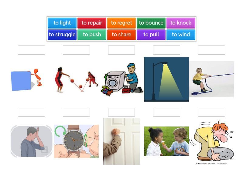 to light, to pull, to push, to struggle, to wind, to share, to regret, to bounce, to knock, to repair,