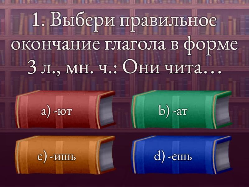 1) 1. Выбери правильное окончание глагола в форме 3 л., мн. ч.: Они чита… a) a) -ют b) b) -ат c) c) -ишь d) d) -ешь 2) 2. Определи спряжение глагола "видеть". a) a) I спряжение b) b) II спряжение c) c) оба d) d) не относится ни к одному 3) 3. Выбери глагол-исключение (II спряжение). a) a) держут b) b) гулять c) c) строить d) d) дышать 4) 4. Вставь пропущенное окончание. Дети рису…т. a) a) -ат b) b) -ят c) c) -ут d) d) -ют