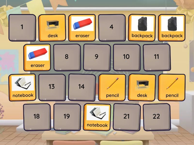 pencil, eraser, notebook, backpack, desk, chair, scissors, ruler, glue, markers, sharpener,