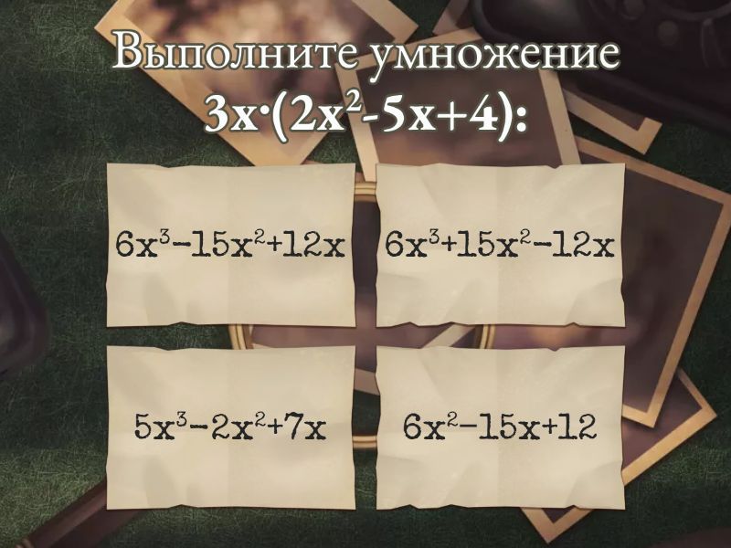 1) Выполните деление многочлена 27b4-18b3 на одночлен 9b: a) 3b3-2b2 b) 3b3+2b2 c) 243b5-162b4 d) 18b3-9b2 2) Выполните умножение 3x⋅(2x2-5x+4): a) 6x2−15x+12  b) 6x3-15x2+12x c) 5x3-2x2+7x d) 6x3+15x2-12x 3) Выполните деление многочлена на одночлен: (15y4-25y3+10y2):5y2: a) 3y2-25y+10 b) 10y2-20y+5 c) 3y2-5y+2 d) 3y2+5y-2 4) Упростите выражение 2a(a-3b): a) 2a2-3b b) 2a2-6a c) 2a2-6ab d) 3a-23ab 5) Найдите произведение одночлена -3b и многочлена 2-2b+b2: a) -6b-2b+b2 b) -6b-6b2-3b3 c) -6b2+6b-3b4 d) -6b+6b2-3b3