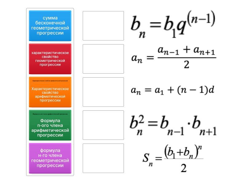 характеристическое свойство геометрической прогрессии, формула н-го члена геометрической прогрессии, сумма бесконечной геометрической прогрессии, Формула n-ого члена арифметической прогрессии, Характеристическое свойство арифметической прогрессии,