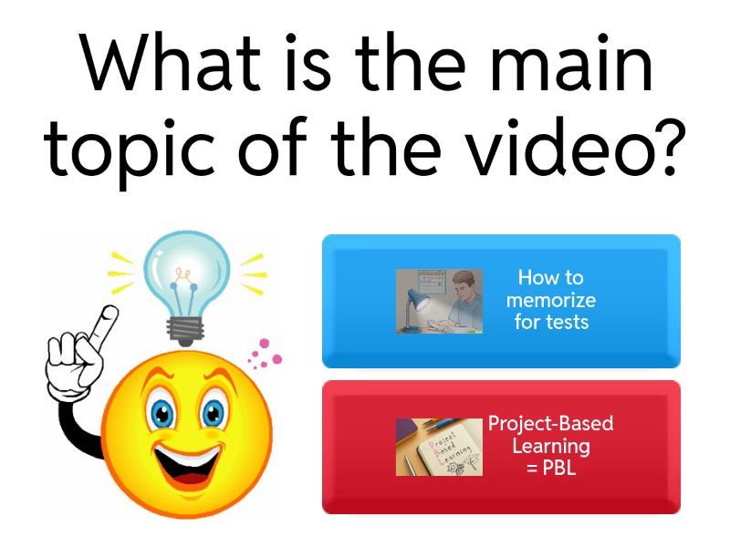 1) What is the main topic of the video? a) How to memorize for tests  b) Project-Based Learning = PBL 2) What skills do students practice in PBL? a) Critical thinking, teamwork, communication b) Only reading or spelling 3) What did Mr. Simmons’ students make for their project? a) A cooking video b) A video and posters 4) What did Mr. Simmons’ class do in their PBL project? a) They read a story b) They helped kids learn about the flu c) They learned about planets 5) Why is PBL helpful? a) Students only memorize information b) Students learn deeply and remember more.