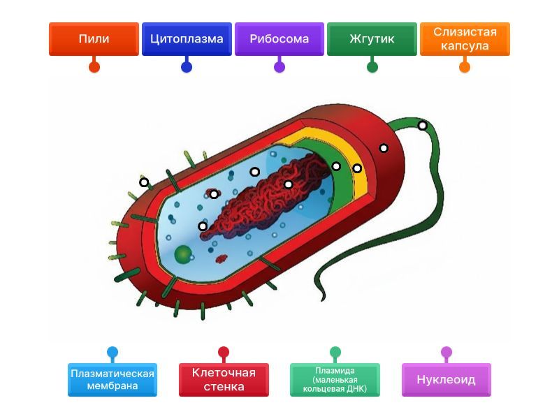 Плазматическая мембрана, Клеточная стенка, Слизистая капсула, Жгутик, Нуклеоид, Цитоплазма, Плазмида (маленькая кольцевая ДНК), Пили, Рибосома.