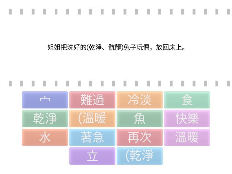 (乾淨 - 姐姐把洗好的(乾淨、骯髒)兔子玩偶,放回床上。, 難過 - 小狗迷路了,低著頭的樣子看起來很(歡樂、難過) 。, (溫暖 - 冬天時,我最愛躺在舒服又(溫暖、寒冷)的被窩裡睡覺。, 魚 - 第一次飛到南方的黑皮,最先發現到南方的什麼東西很多?, 快樂 - 黑皮和同伴一起生活的時候,感覺怎麼樣?, 宀 - 寒, 食 - 飽, 水 - 沙, 立 - 站, 著急 - 深呼吸可以緩和( 著急 / 放鬆 )的心情。, 再次 - 這場表演好精采,期待能 ( 再見 / 再次)參加這麼有趣的活動。, 冷淡 - 我們都對魔術師的道具感到非常「好奇」,但是他對我們的提問卻很( 奇妙 / 冷淡 )。, 乾淨 - 我們合力把「骯髒」的房間打掃( 快樂 / 乾淨 )。, 溫暖 - 春天的天氣多變,前幾天還很「寒冷」,今天突然放晴,感覺( 溫暖 / 涼爽 )多了。,