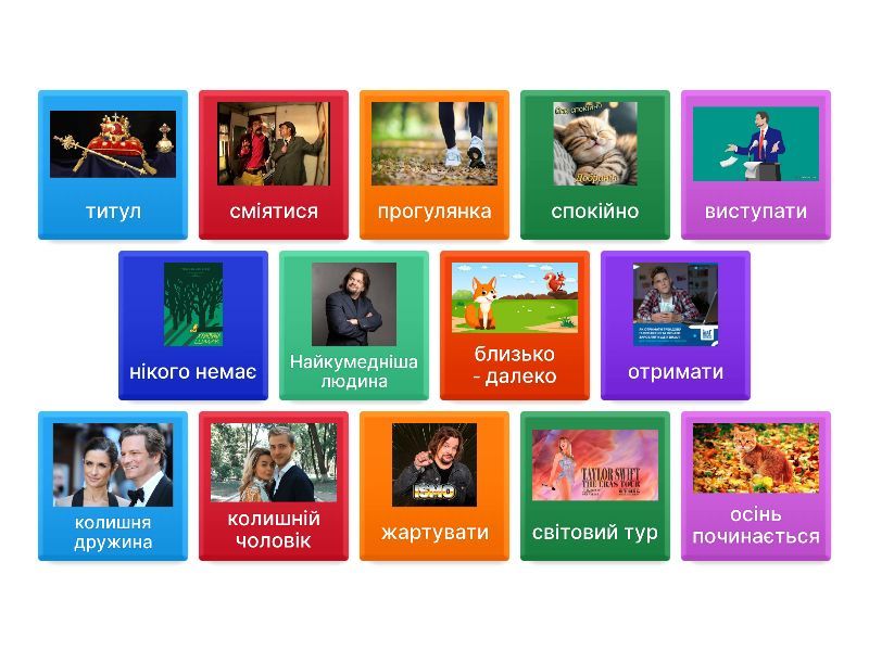 жартувати - vitsailla, виступати - esiintyä, сміятися - nauraa, світовий тур - maailmankiertue, колишня дружина - entinen vaimo, колишній чоловік - entinen mies, отримати - saada, прогулянка - kävely я на прогулянці, осінь починається - syksy alkaa, нікого немає - ei ole ketään, близько - далеко - lähellä - kaukana, спокійно - rauhallisesti, титул - titteli, Найкумедніша людина - hauskin ihminen,