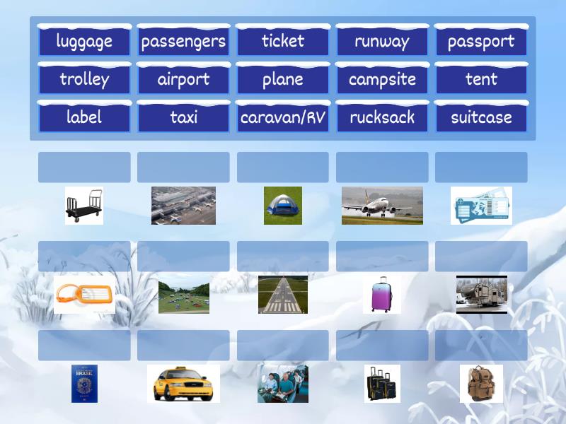 tent, caravan/RV, campsite, rucksack, suitcase, luggage, trolley, label, passport, ticket, passengers, airport, taxi, runway, plane,