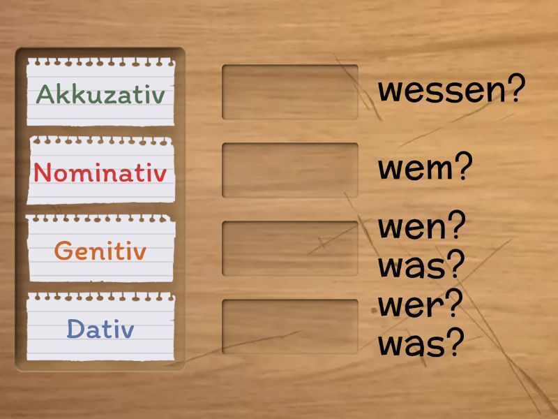 Nominativ - wer? was?, Genitiv - wessen?, Dativ - wem?, Akkuzativ - wen? was?,