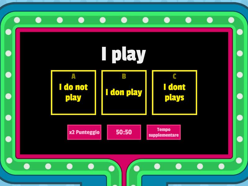 1) I play a) I do not play b) I don play c) I dont plays 2) You play a) You do not plays b) You dont play c) You don't play 3) She plays a) She do not play b) She dont plays c) She don't plays 4) They play a) They do not play b) They don't plays c) They donnot play 5) We play a) We don play b) We do not play c) We do no play