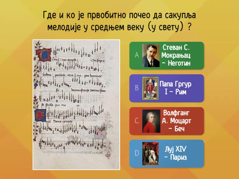 1) Где и ко је првобитно почео да сакупља мелодије у средњем веку (у свету) ? a) Стеван С. Мокрањац - Неготин b) Папа Гргур I - Рим c) Волфганг А. Моцарт - Беч d) Луј XIV - Париз 2) Инструментална музика је почела да се развија у 9 веку, а првобитни инструменти који су се користили су...? (изабери четири инструмента за које сматраш да су се користили у средњем веку) a) Виолина b) Лаута c) Рог d) Клавир e) Харфа f) Фидула (виела) 3) Музика у средњем веку се делила на два типа (изабери два одговора која мислиш да су тачна) ? a) Фолк музика b) Класична музика c) Световна музика d) Духовна музика e) Инструментална музика 4) Захваљујући коме се у 9 веку развијала словенска црквена музика ? a) Стеван Христић b) Даворин Јенко c) Ћирило и Методије d) Свети Сава 5) Средњовековна музика у Србији је била инспирисана .... a) Римском (западном) музиком b) Руском музиком c) Византијском (источном) музиком d) Келтском музиком 6) Зборник напева који се изводе на литургији назива се? a) Кондак b) Грегоријански корал c) Осмогласник 7) За музику у Византији карактеристично је ... a) Једногласно певање са инструменталном пратњом b) Вишегласно певање без инструменталне пратње c) Једногласно певање без инструменталне пратње d) Вишегласно певање са инструменталном пратњом 8) Како зовемо службу у источној цркви ? a) Литургија b) Миса 9) Како зовемо службу у западној цркви ? a) Литургија b) Миса 10) Духовне мелодије на западу звале су се ... a) сонате b) серенаде c) корали d) мотети e) оперете 11) Папа Гргур 1 изабрао је корале за богослужење искључиво на ком језику ? a) Италијанском b) Народном c) Немачком d) Латинском 12) Од дванаестог века инструменталну пратњу у католичким црквама даје који инструмент ? a) клавир b) чембало c) дромбуље d) оргуље e) харфа f) виолина 13) Оргуље припадају којој групи инструмената ? a) дувачки b) гудачки c) инструменти са диркама d) ударачки 14) Вишегласна композиција, МОТЕТ, у почетку је писана на латинском језику и обухватала духовне теме, а касније .... a) на старогрчком језику и обухватала духовне теме b) на старогрчком и обухватала (свакодневне) световне теме c) на латинском језику и обухватала духовне теме d) на латинском и обухватала (свакодневне) световне теме 15) Како су се звале прве ноте ? a) тачке b) ноте c) неуме 16) Ко је осмислио први линијски систем ? a) Папа Гргур 1 b) Гвидо из Ареца c) Мокрањац d) Моцарт e) Јован Дамаскин