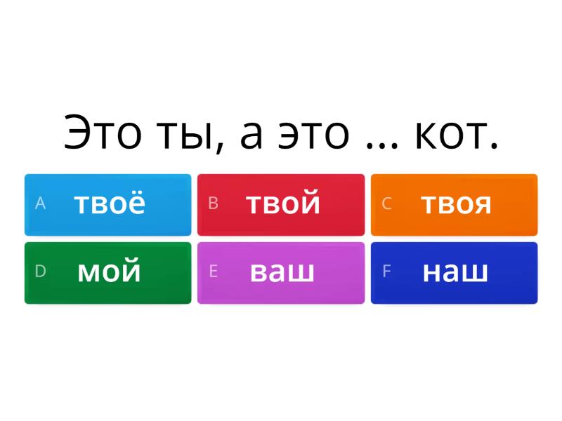 1) Это я, а вот слева ... тётя. a) наше b) наша c) ваш d) моя e) твоя f) моё 2) Это вы, а это ... сестра. a) твоя b) моя c) ваша d) ваш e) ваше f) наша 3) Это ты, а вот справа ... мама. a) моя b) ваша c) твоя d) наша e) твой f) твоё 4) Это мы, а это ... город. a) наш b) наше c) наша d) твоё e) моя f) ваш 5) Это я, а вот прямо ... комната. a) твоя b) твой c) моя d) моё e) наша f) ваша 6) Это мы, а это ... квартира. a) моя b) наша c) твоя d) наш e) наше f) ваша 7) Это ты, а это ... кот. a) твоё b) твой c) твоя d) мой e) ваш f) наш 8) Вот я, а это ... дядя a) твой b) ваш c) мой d) наш e) моя f) моё 9) Вот вы, а вот ... дом. a) наш b) ваш c) ваша d) ваше e) твой f) мой