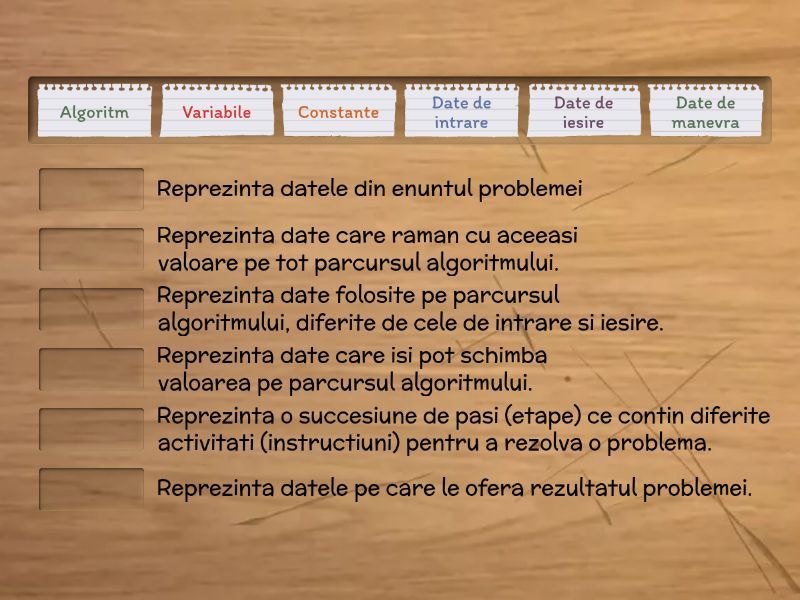 Algoritm - Reprezinta o succesiune de pasi (etape) ce contin diferite activitati (instructiuni) pentru a rezolva o problema., Date de intrare - Reprezinta datele din enuntul problemei, Date de iesire - Reprezinta datele pe care le ofera rezultatul problemei., Date de manevra - Reprezinta date folosite pe parcursul algoritmului, diferite de cele de intrare si iesire., Constante - Reprezinta date care raman cu aceeasi valoare pe tot parcursul algoritmului., Variabile - Reprezinta date care isi pot schimba valoarea pe parcursul algoritmului.,