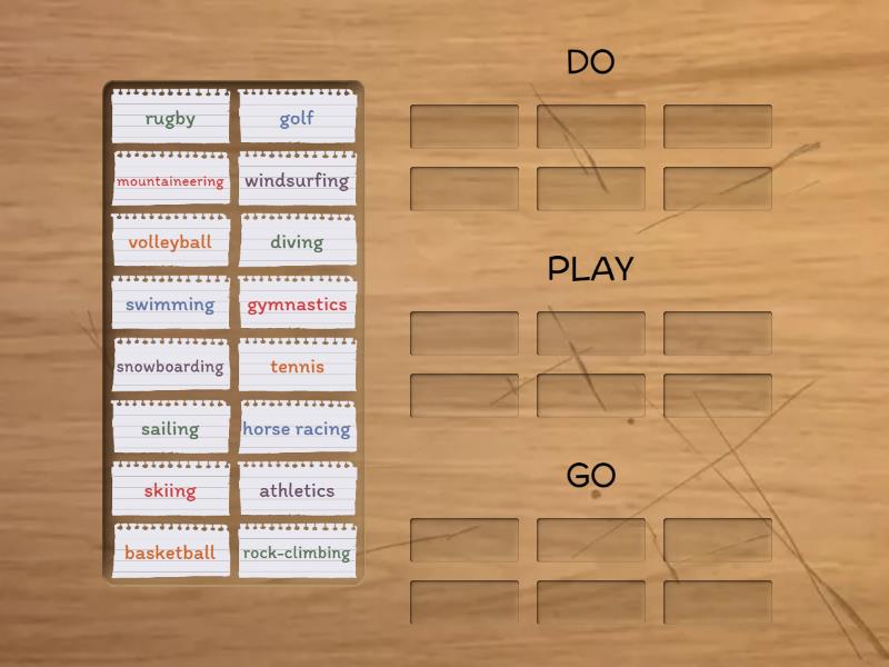 DO: gymnastics, rock-climbing, athletics, horse racing, mountaineering, PLAY: tennis, golf, rugby, basketball, volleyball, GO: sailing, swimming, snowboarding, windsurfing, skiing, diving,
