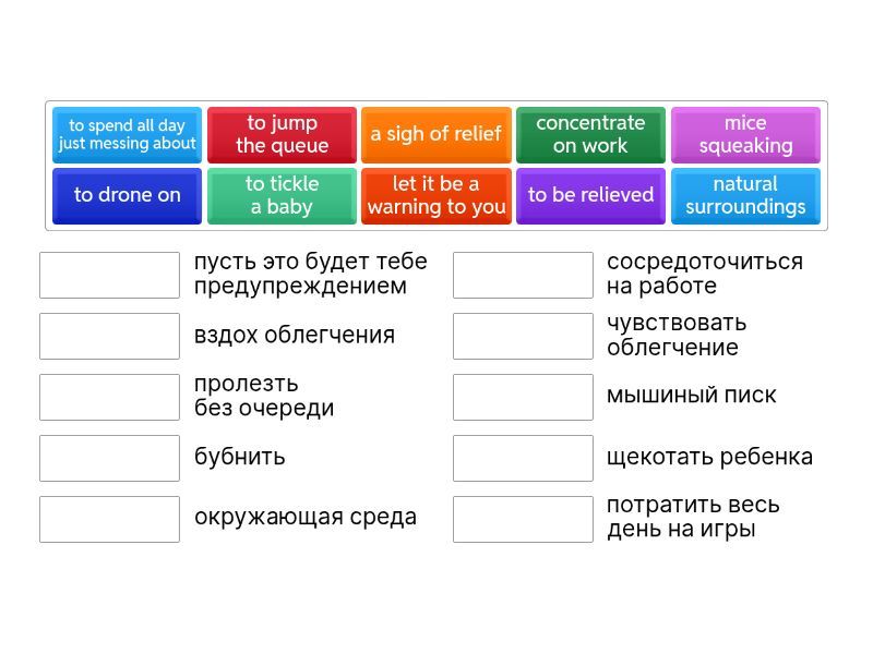 concentrate on work - сосредоточиться на работе, natural surroundings - окружающая среда, to be enrolled at the university - быть зачисленным в университет, to jump the queue - пролезть без очереди, queue jumper - человек, проходящий без очереди, to vanish into air - раствориться в воздухе, the smile vanished from the face - улыбка исчезла с лица, to tickle a baby - щекотать ребенка, solid advice - надежный совет, to force your way - проложить дорогу, by force - силой, from force of habit - в силу привычки, mice squeaking - мышиный писк, What a mess! - Что за бардак! , to spend all day just messing about - потратить весь день на игры, it's rather complicated to explain - это довольно сложно объяснить, to be relieved - чувствовать облегчение, a sigh of relief - вздох облегчения, to drone on - бубнить, let it be a warning to you - пусть это будет тебе предупреждением,