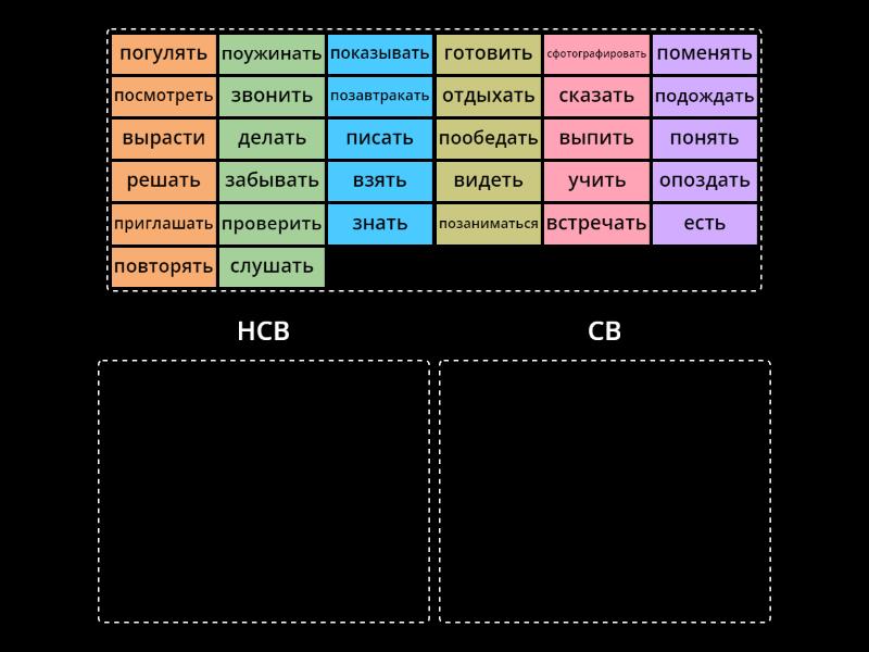 НСВ: писать, знать, делать, учить, приглашать, звонить, слушать, встречать, показывать, видеть, готовить, отдыхать, решать, забывать, повторять, есть, СВ: проверить, погулять, взять, сфотографировать, посмотреть, вырасти, понять, поужинать, выпить, сказать, позавтракать, поменять, пообедать, подождать, позаниматься, опоздать,