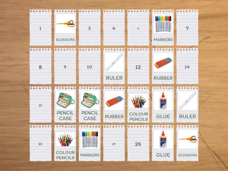 RUBBER, COLOUR PENCILS, MARKERS, SCISSORS, RULER, PENCIL CASE, GLUE, SHARPENER, PEN, WRITING PENCIL, SCHOOL BAG, BOOKS, HIGHLIGHTER, CRAYON,