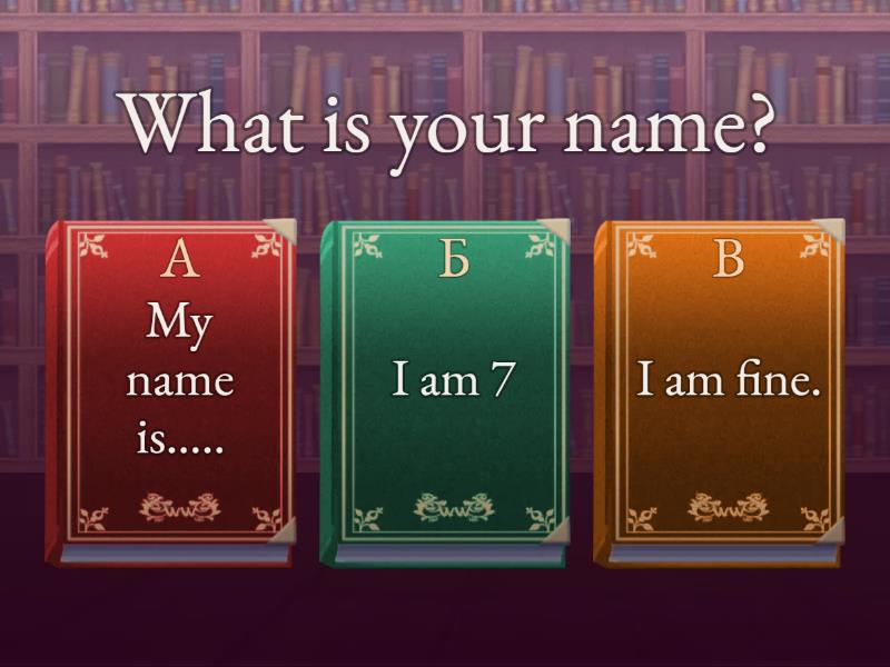 1) What is your name? a) My name is..... b) I am 7 c) I am fine. 2) How old are you? a) I am fine b) I am 7 c) My name is..... 3) How are you? a) I am 10 b) My name is... c) I am good 4) What is your favourite colour? a) My favourite colour is red b) I am a girl c) I am great 5) What is your favourite toy? a) My favourite toy is a robot b) I am a boy. c) I am four 6) What is your favourite animal? a) My favourite colour is green b) My favourite animal is a dog c) My favourite toy is a car 7) What is your surname? a) My surname is Shevchenko b) I am ten c) I am fine