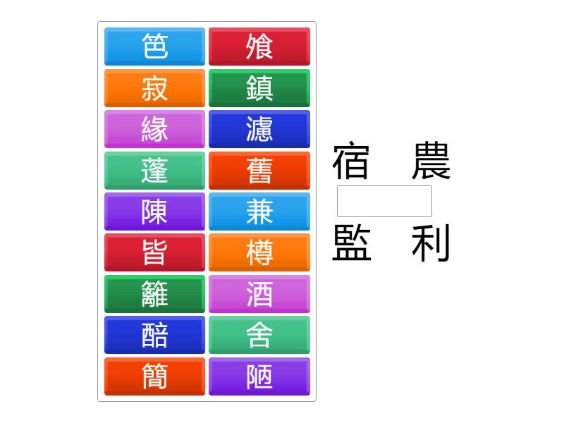 宿 農 ____ 監 利 率 ____ 知 是 機 人 ____ 由 故 蓮 ____ 鬆 勃 盤 壺 饔   ____   ____ 顧 併 管  金 移____就教 米 喜 ____ 精 杯 依 懷 ____ 人 事 玉 黍 潑   ____ 藩 綠 ____ 笆 精 從 ____ 單 潔 粗 淺 ____ 室 習 鄉 坐 ____ 定 靜 過 ____ 紙 心 籬 ____ 簍 孤 沉 ____ 寞 靜 鋪 雜 ____ 列 年