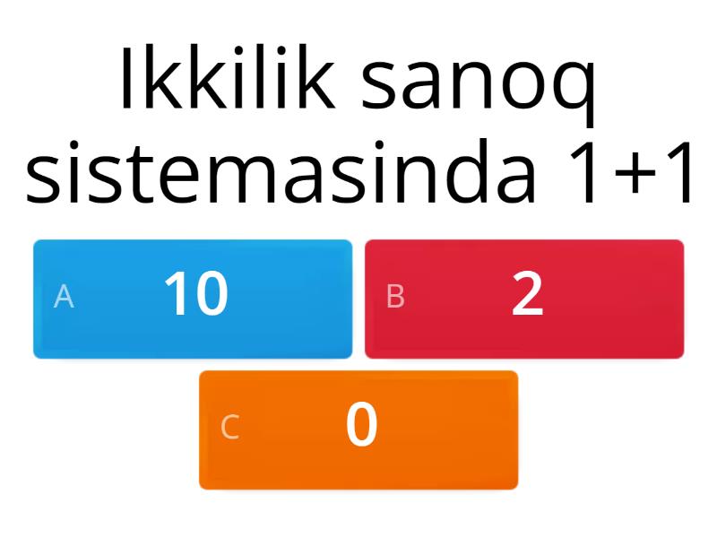 1) Ikkilik sanoq sistemasinda 1+1 a) 10 b) 2 c) 0 2) Sanoq sistemasi shakliga ko'ra necha turga bo'linadi a) 3 b) 2 c) 4 3) Word qanday radaktor a) Jadvalli b) Tekstli 4) Elektron hisoblash mashinalarinig nechta avlidi bor a) 1 b) 2 c) 3 d) 4 5) Teri badan sezgisi qaysi axborot manbasi bilan mos keladi? a) Shamol b) Asal c) Rasm d) Atir 6) Ta’m bilish sezgisi qaysi axborot manbasi bilan mos keladi? a) Shamol b) Asal c) Rasm d) Atir 7) Telegraf kodini ishlab chiqqan inson nomini aniqlang a) Morze b) Paskal c) Sezar 8) 5 sonini sakkizlik sanoq sistemasida yozilishini tanlang a) 101 b) 6 c) 2 d) 5 9) Axborotning eng kichik o’lchov birligi nima? a) Bit b) Bayt c) Kbayt d) Mbayt 10) Dunyoning turli mamlakatlaridagi foydalanuvchilarning o’zaro axborot almashishini ta’minlovchi tarmoq….deb ataladi. a) Global b) lokal c) Mahalliy d) Mintaqaviy