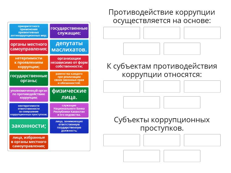 Противодействие коррупции осуществляется на основе:: законности;, равенства каждого при реализации своих законных прав и обязанностей;, приоритетного применения превентивных антикоррупционных мер;, нетерпимости к проявлениям коррупции;, неотвратимости ответственности за совершение коррупционных проступков;, К субъектам противодействия коррупции относятся:: уполномоченный орган по противодействию коррупции;, государственные органы;, органы местного самоуправления;, организации независимо от форм собственности;, физические лица., Субъекты коррупционных проступков.: лица, занимающие ответственную государственную должность;, государственные служащие;, депутаты маслихатов., лица, избранные в органы местного самоуправления;, служащие Национального Банка Республики Казахстан и его ведомства.,