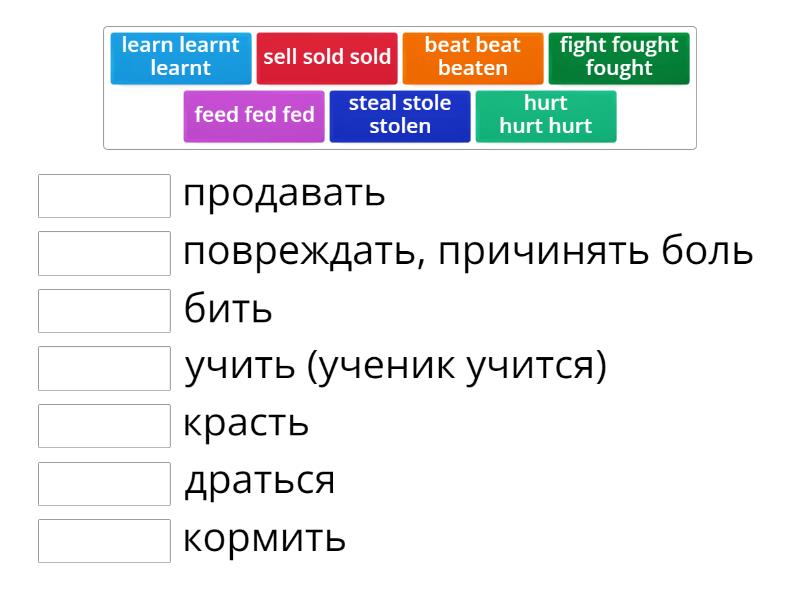 beat beat beaten - бить , feed fed fed - кормить , fight fought fought  - драться , hurt hurt hurt - повреждать, причинять боль , learn learnt learnt  - учить (ученик учится) , sell sold sold  - продавать, steal stole stolen  - красть ,