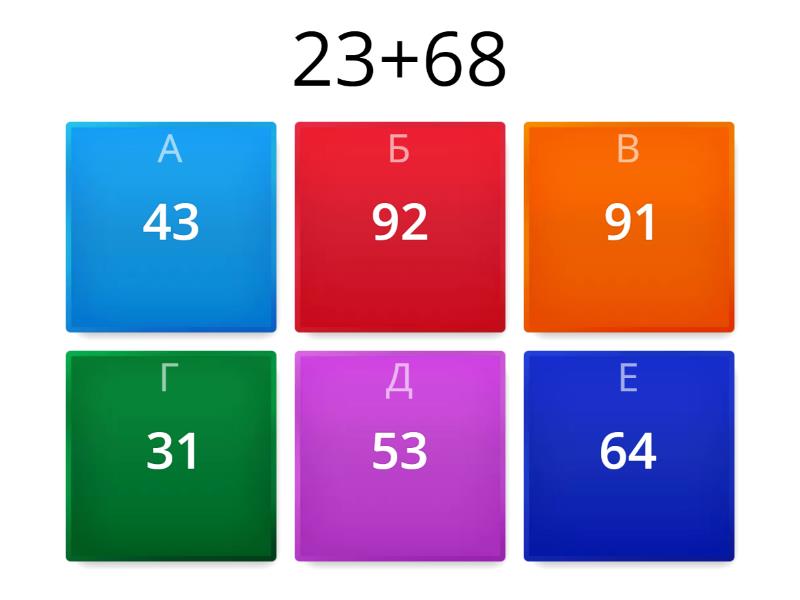1) 23+68 a) 43 b) 92 c) 91 d) 31 e) 53 f) 64 2) 34+29 a) 31 b) 12 c) 79 d) 62 e) 63 f) 74 3) 32+49 a) 81 b) 31 c) 74 d) 84 e) 91 f) 64 4) 16+47 a) 56 b) 12 c) 77 d) 18 e) 65 f) 63 5) 57+37 a) 65 b) 95 c) 14 d) 94 e) 51 f) 88 6) 44+18 a) 62 b) 41 c) 55 d) 91 e) 82 f) 69 7) 55+36 a) 64 b) 91 c) 51 d) 90 e) 88 f) 14 8) 67+14 a) 12 b) 95 c) 77 d) 14 e) 46 f) 81 9) 15+57 a) 88 b) 61 c) 72 d) 51 e) 49 f) 40 10) 59+13 a) 77 b) 72 c) 44 d) 90 e) 57 f) 87