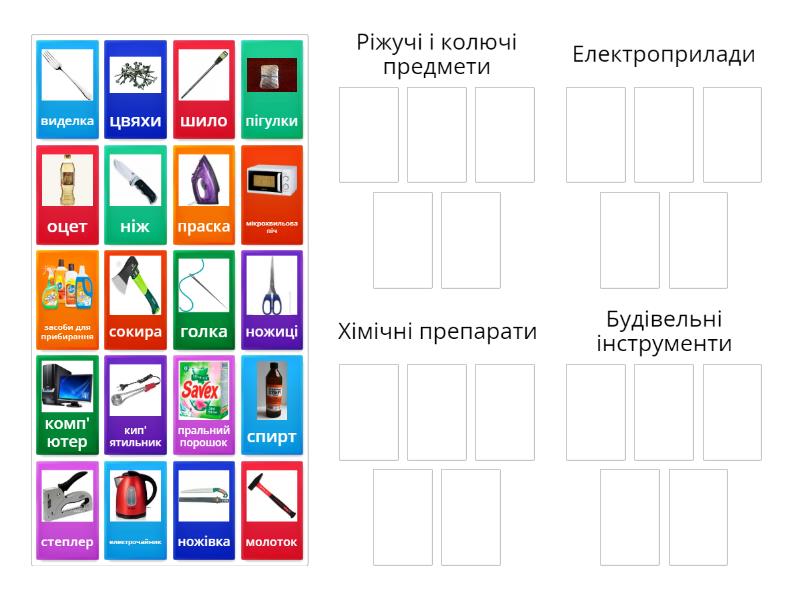 Ріжучі і колючі предмети: ніж, виделка, шило, ножиці, голка, Електроприлади: праска, кип' ятильник, електрочайник, мікрохвильова піч, комп' ютер, Хімічні препарати: пігулки, пральний порошок, оцет, засоби для прибирання, спирт, Будівельні інструменти: сокира, цвяхи, молоток, ножівка, степлер,