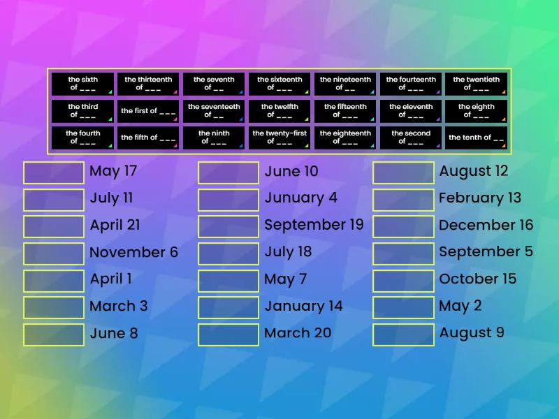 the first of ___ - April 1, the second of ___ - May 2, the third of ___ - March 3, the fourth of ___ - Junuary 4, the fifth of ___ - September 5, the sixth of ___ - November 6, the seventh of __ - May 7, the eighth of ___ - June 8, the ninth of ___ - August 9, the tenth of __ - June 10, the eleventh of ___ - July 11, the twelfth of ___ - August 12, the thirteenth of ___ - February 13, the fourteenth of ___ - January 14, the fifteenth of ___ - October 15, the sixteenth of ___ - December 16, the seventeeth of __ - May 17, the eighteenth of ___ - July 18, the nineteenth of __ - September 19, the twentieth of ___ - March 20, the twenty-first of ___ - April 21,