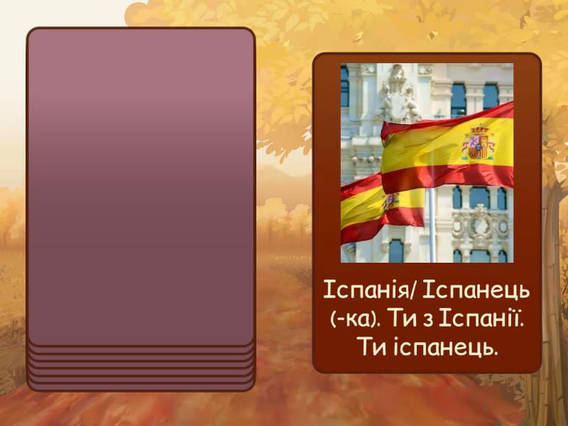 Аргентина/ Аргентинець (-ка). Я з Аргентини. Я аргентинка., Бразилія/ Бразилець. Він з Бразилії. Він бразилець., Китай/ Китаєць, китаянка. Вони з Китаю. Вони китайці., Італія/Італієць. Моя мама з Італії. Моя мама італійка., Мексика/ Мексиканець (-ка). Ця дівчинка з Мексики. Вона мексиканка., Україна/Українець (-ка). Ми з України. Ми українці., Іспанія/ Іспанець (-ка). Ти з Іспанії. Ти іспанець., Туреччина/ Турок. Він з Туреччини. Він турок..