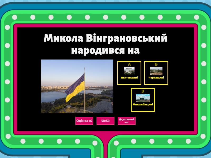 1) Микола Вінграновський народився на a) Полтавщині b) Черкащині c) Миколаївщині 2) Річечку в поезії «Сама собою річка ця тече...» автор порівнює із a) хмаринкою b) стежинкою c) дівчиною d) долонею 3) Річечка є донечкою a) Дністра b) Дніпра c) Черемоша 4) Де тече річечка ? a) В нас у селі b) Серед лісу c) Посеред вулиці d) В городі в нас під кленом e) Під вишнею в саду 5) Ліричний герой любить річечку як і a) солодощі b) борщ c) маму, тата і мед d) Сад e) небо і хмарки 6) Хата ліричного героя пахне a) борщем b) медом c) садом 7) Вірш "Сама собою річка ця тече " про a) спогади про рідний дім Миколи Вінграновського b) спогади про клен та город c) школу та друзів