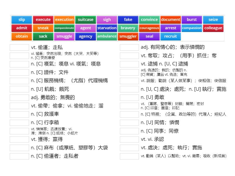 agent - n. [C] 特務;(企業、政治等的)代理人;經紀人, agency - n. [C] 服務機構;(尤指)代理機構, burst - vi. 猛衝;突然出現;突然(大哭、大笑等) n. [C] 突然爆發, slip - vt. 悄悄塞;迅速放置;vi. 滑;滑倒 n. [C] 紙條;小紙片, arrest - vt. 逮捕 n. [U, C] 逮捕, sigh - n. [C] 嘆氣;嘆息 vi. 嘆氣;嘆息, compassionate - adj. 有同情心的;表示憐憫的, compassion - n. [U] 同情;憐憫, seize - vt. 奪取;攻占;(用手)抓住;奪, starvation - n. [U] 飢餓;餓死, seal - vt. (軍隊、警察等)封鎖;關閉;密封 n. [C] 印章;圖章;印記, recruit - vt. 動員(某人)以幫助;vt. vi. 徵募;吸收(新成員), colleague - n. [C] 同事;同僚, sneak - vt. 偷帶;偷拿;vi. 偷偷地走;溜, obtain - vt. 獲得;贏得, convince - vt. 說服;勸說(某人做某事);使相信;使信服, suitcase - n. [C] 行李箱, sack - n. [C] 麻布(或厚紙、塑膠等)大袋, smuggle - vt. 偷運;走私, smuggler - n. [C] 偷運者;走私者, ambulance - n. [C] 救護車, courageous - adj. 勇敢的;無畏的, execution - n. [U, C] 處決;處死;n. [U] 執行;實施, execute - vt. 處決;處死;執行;實施, fake - adj. 偽造的;假的;仿製的 n. [C] 假貨;贋品 vt. 偽造;冒充, document - n. [C] 證件;文件, admit - vt. vi. 承認, bravery - n. [U] 勇敢,