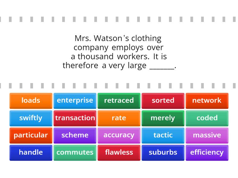 enterprise - Mrs. Watson’s clothing company employs over a thousand workers. It is therefore a very large _______., transaction - Every time someone buys something at the convenience store, the ______ is saved in the shop’s computer system., rate - The total number of visitors to the zoo is increasing at a _______ of around fifty thousand people a year., merely - It’s best to thank someone in person rather than _______ send them an email or a text message., accuracy - The problem is that the more we go into the past, the less ________ we can attain., suburbs - Most people live out in the ________ and travel into the city center for work every workday., commutes - Steve usually ________ from his house to the office by train. He only drives his car on weekends., network - Switzerland’s well-developed rail _______ allows you to travel by train to almost anywhere in the country within just a few hours., efficiency - The workers are spending too much time waiting in line to make copies. Thus, a second printer in the office will increase ________., swiftly - Running _______ to get away from the young lions, the zebra just managed to escape being caught and eaten., sorted - Airline staff _______ the passengers into three main groups according to where they were sitting on the plane., loads - Every morning, the baker _______ all the bread into the van and starts making his rounds., retraced - With the security guard approaching, the thief swiftly _______ her steps to the wall and hid in the shadows., massive - The existence of snakes can be traced all the way back to the time when _______ thirty-ton dinosaurs ruled the earth., handle - Don’t _______ any of the cubs, because the mother bear might reject them if they smell of humans., coded - Each library book is _______ with a special combination of letters and numbers. This makes them all easy to find., particular - Is there anything in ________ that Grandpa would like for Christmas, or does he want us to surprise him?, scheme - Martin came up with an ingenious _________ to organize all the kitchen items, so storing them is consequently much easier., tactic - Because the other boxer had a powerful left hook, Vinny’s _______ was to try to stay on his left side., flawless - After such a ______ dance routine, the judges had no choice but to give the couple a perfect ten.,