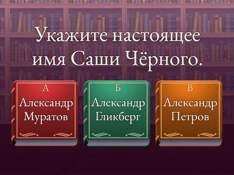 1) Укажите настоящее имя Саши Чёрного. a) Александр Муратов b) Александр Гликберг c) Александр Петров 2) К какому периоду русской поэзии относится творчество Саши Чёрного? a) К серебряному веку b) К золотому веку c) К фольклорной поэзии 3) Какой вид литературных произведений принес первую известность Саше Чёрному? a) Басни b) Сатирические стихи c) Рассказы 4) Где родился поэт? a) В Москве b) ВПетербурге c) В Одессе 5) Кем был Саша Черный? a) Поэт b) писатель c) все ответы верны 6) Первое стихотворение Саши Чёрного «Чепуха» (1905) увидело свет в журнале….. a) Зритель b) Зеркало c) Костер 7) Как называется стихотворение, которое в 1905 году принесло Саше Черному большую популярность? a) Ерунда b) Чепуха c) Пустяк 8) Как назывался популярный в России журнал, в котором Саша Черный печатался наряду с самыми известными юмористами? a) Сатирикон b) Тэффи c) Крокодил 9) В библиографию поэта вошло более «….» книг. a) 50 b) 40 c) 30 10) Где похоронен Саша Чёрный? a) В Москве b) Во Франции c) В Одессе