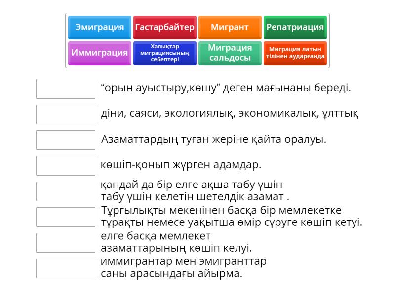 Гастарбайтер   - қандай да бір елге ақша табу үшін табу үшін келетін шетелдік азамат . , Мигрант - көшіп-қонып жүрген адамдар., Иммиграция - елге басқа мемлекет азаматтарының көшіп келуі., Эмиграция - Тұрғылықты мекенінен басқа бір мемлекетке тұрақты немесе уақытша өмір сүруге көшіп кетуі. , Репатриация - Азаматтардың туған жеріне қайта оралуы., Миграция сальдосы - иммигрантар мен эмигранттар саны арасындағы айырма. , Миграция латын тілінен аударғанда - “орын ауыстыру,көшу” деген мағынаны береді., Халықтар миграциясының себептері - діни, саяси, экологиялық, экономикалық, ұлттық,